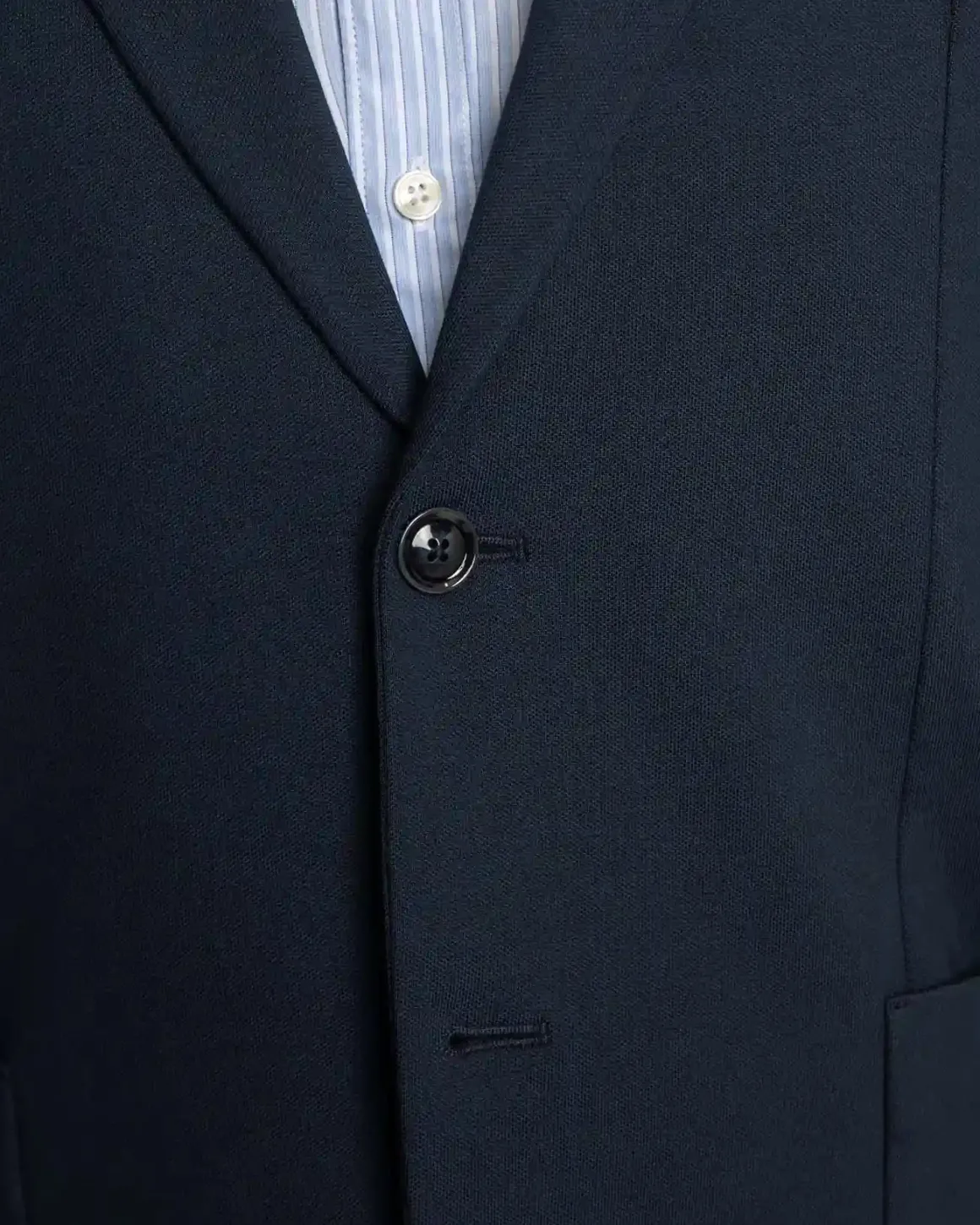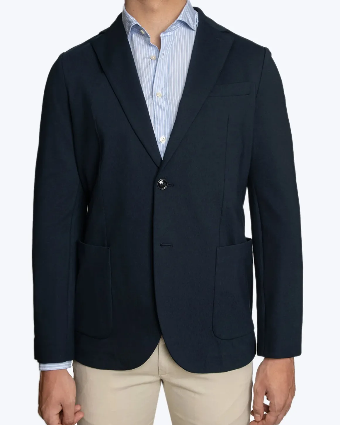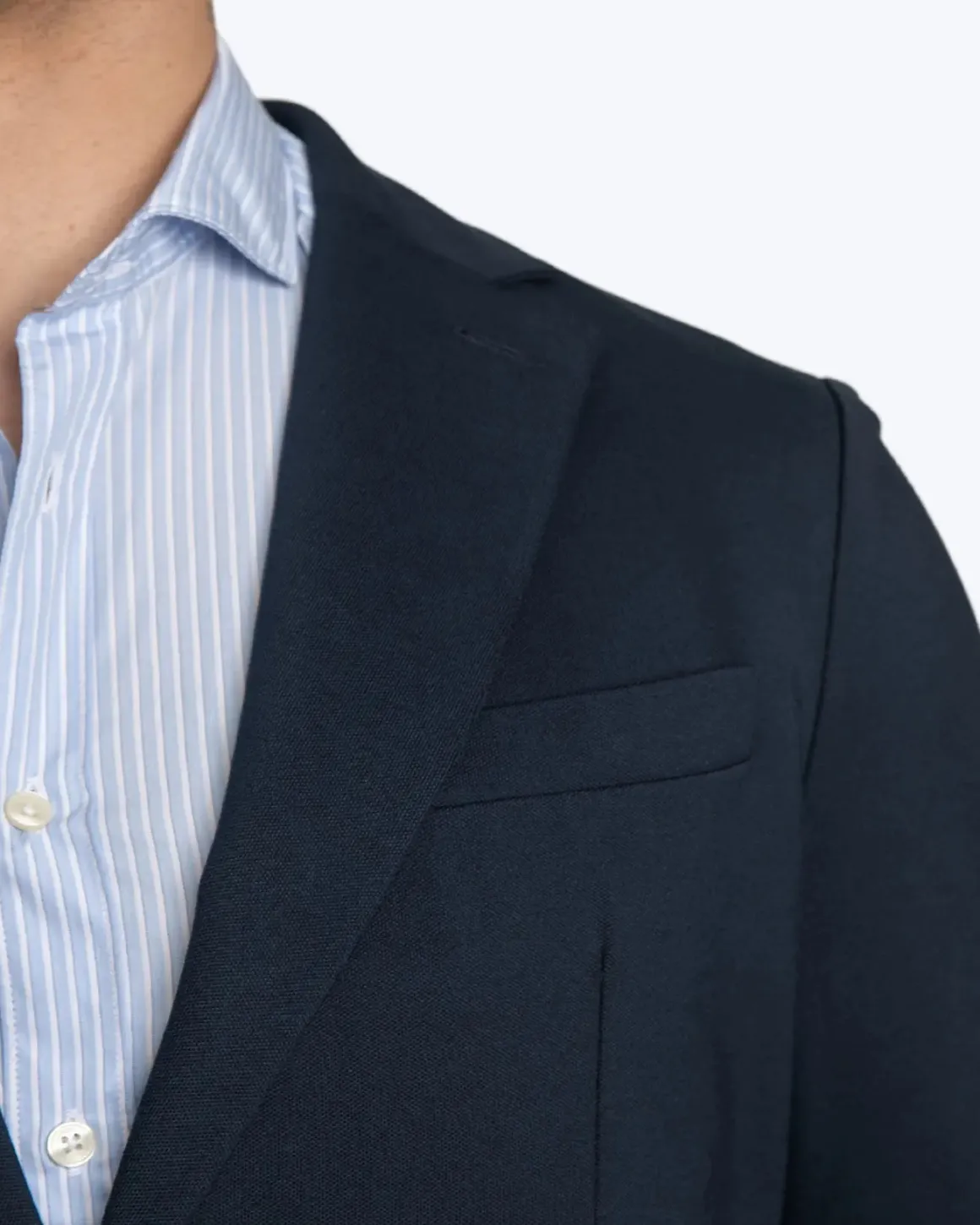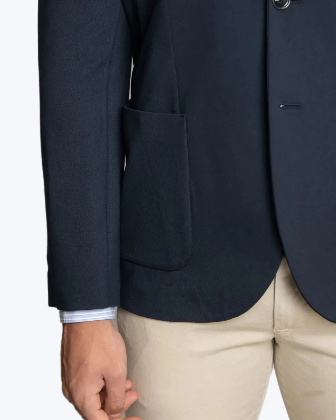 Se abrocha con dos botones, y tiene dos bolsillos delanteros, uno pequeño en el pecho, y también dos interiores. En la espalda, dos aberturas.