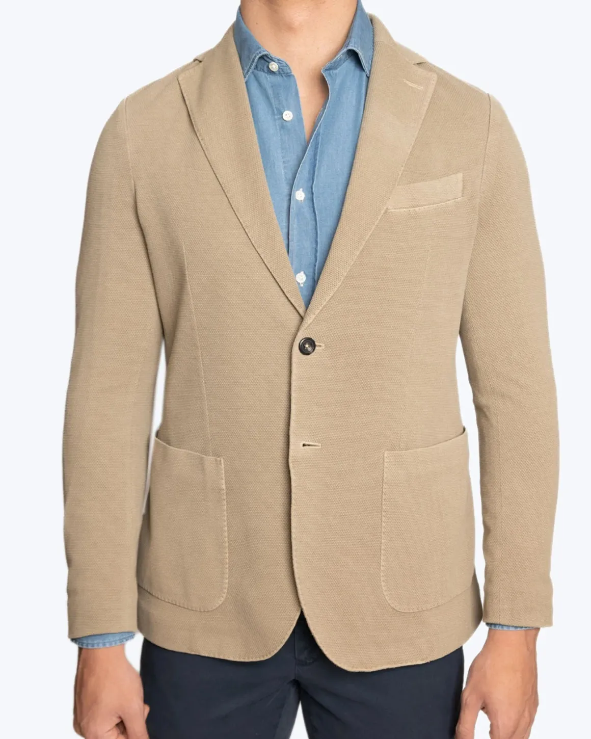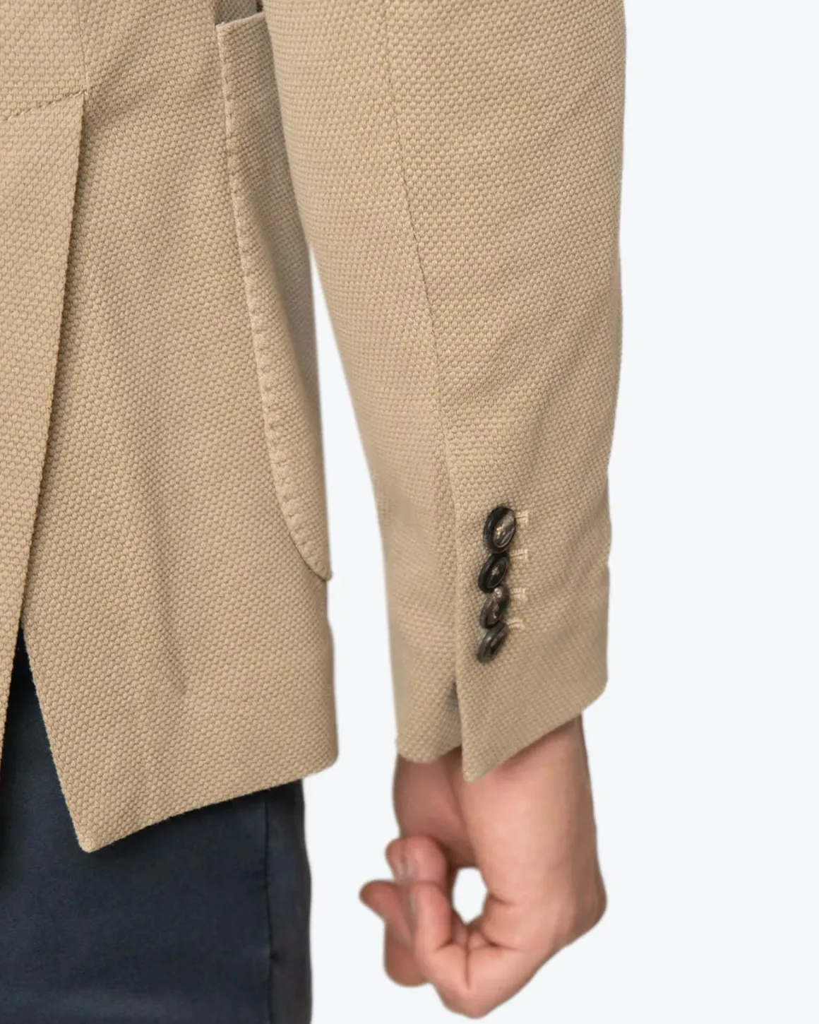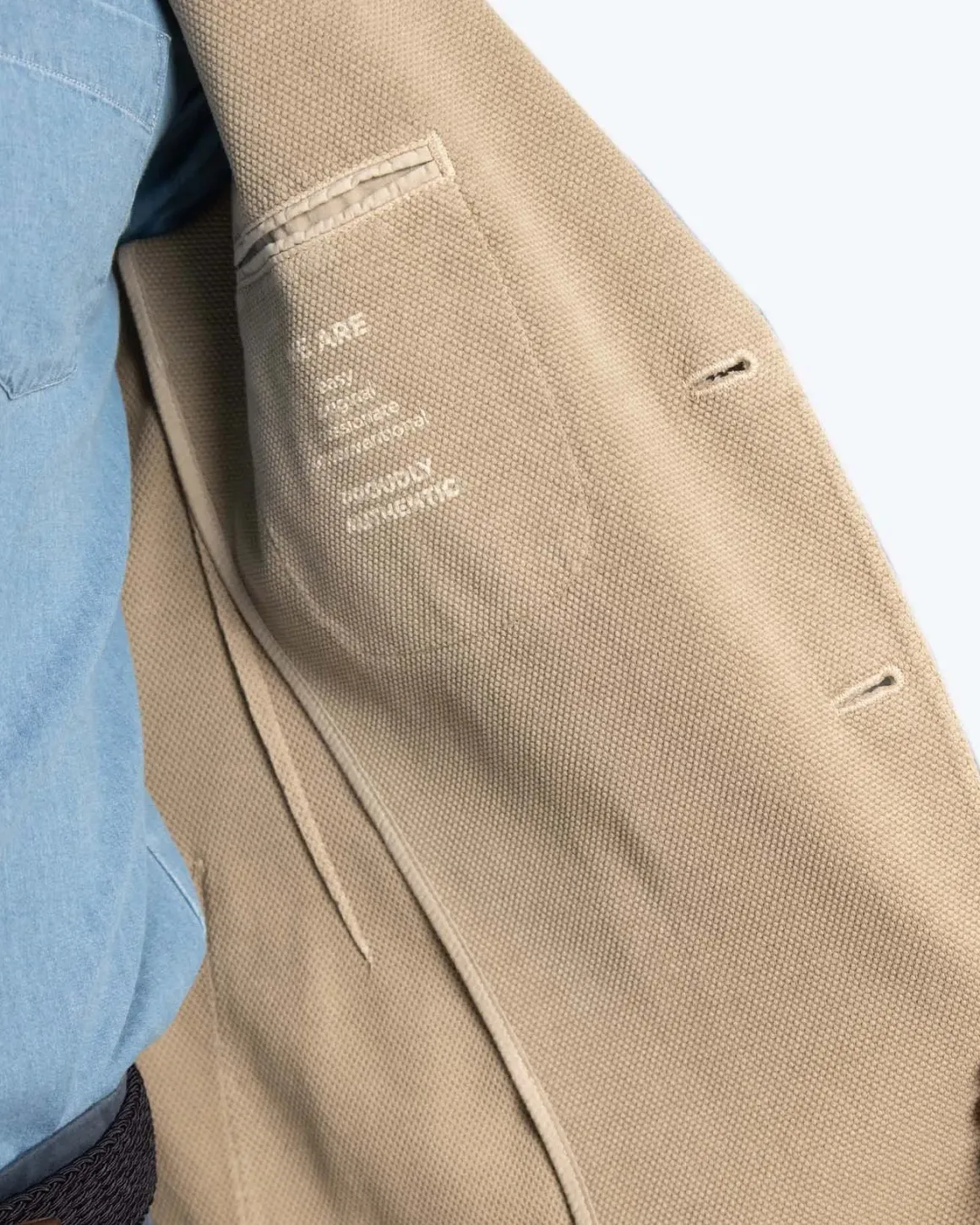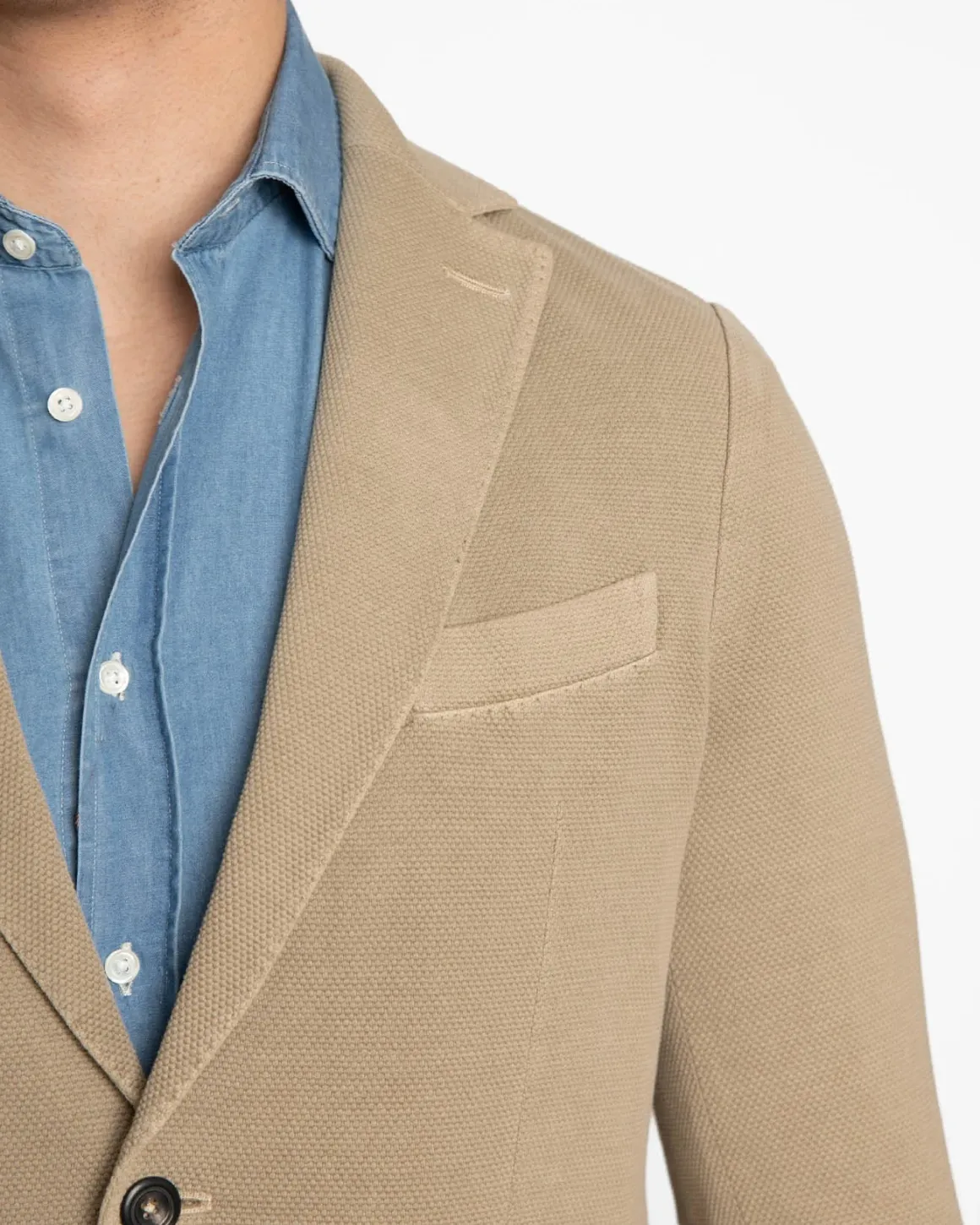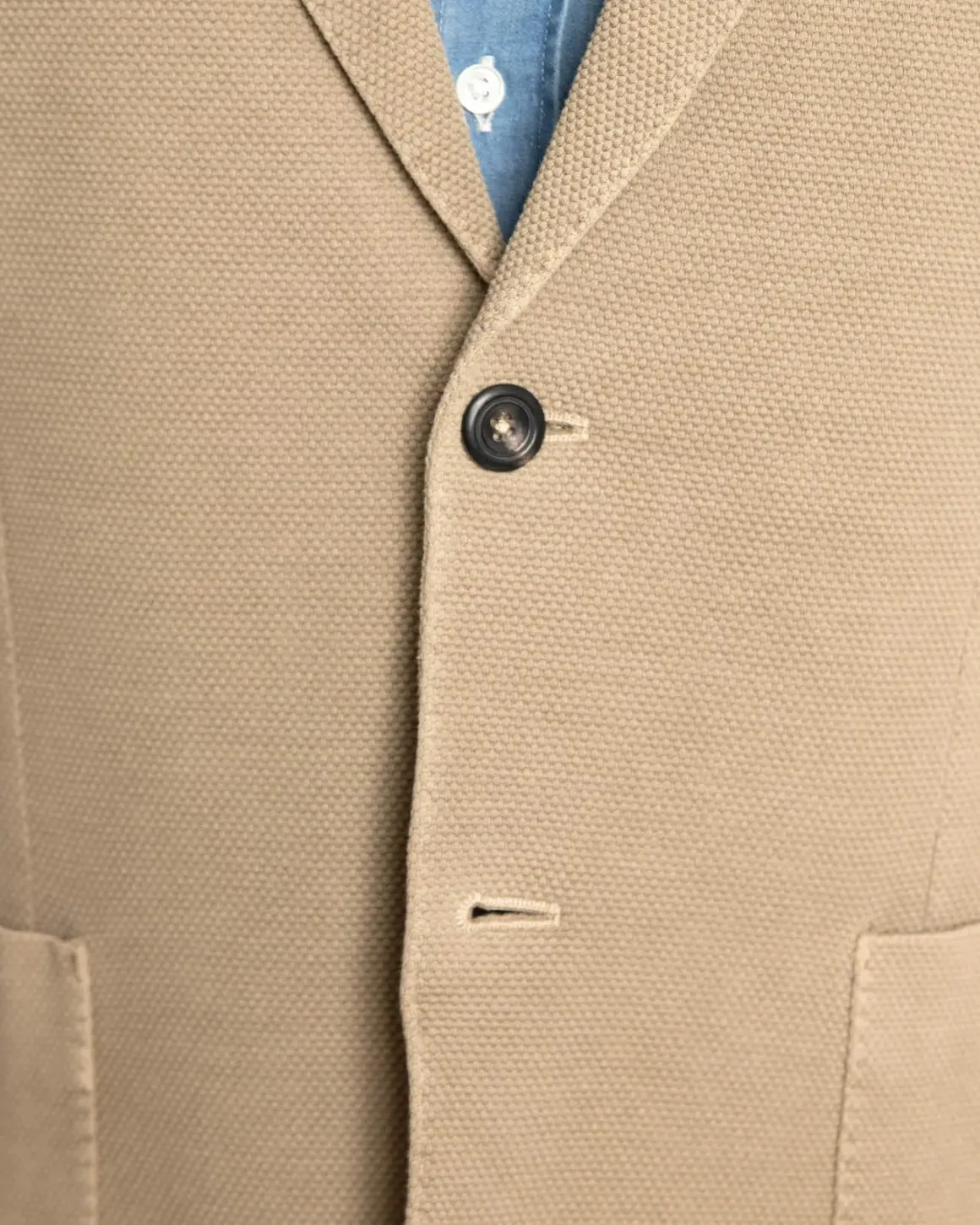 Se abrocha con dos botones, y tiene dos bolsillos delanteros, uno pequeño en el pecho, y también dos interiores. En la espalda, dos aberturas.