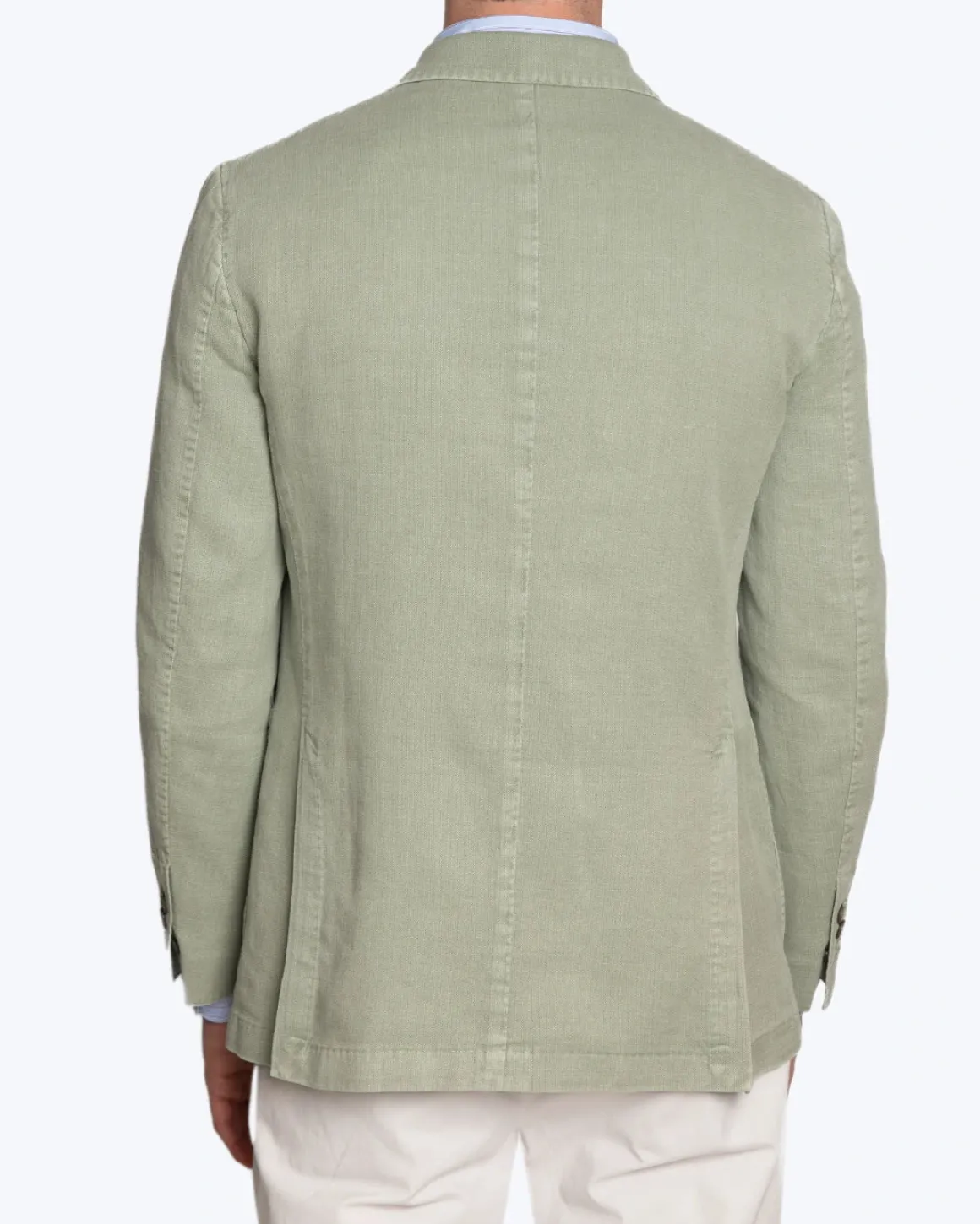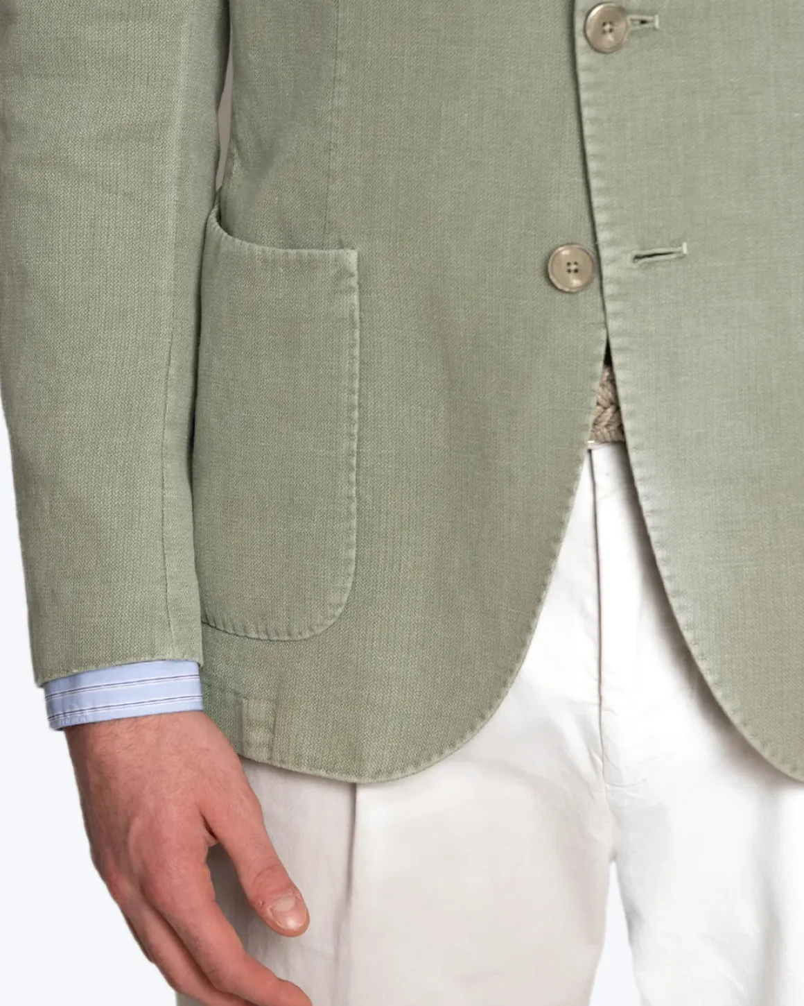 Se abrocha con dos botones, y tiene dos bolsillos delanteros, uno pequeño en el pecho, y también dos interiores. En la espalda, dos aberturas.