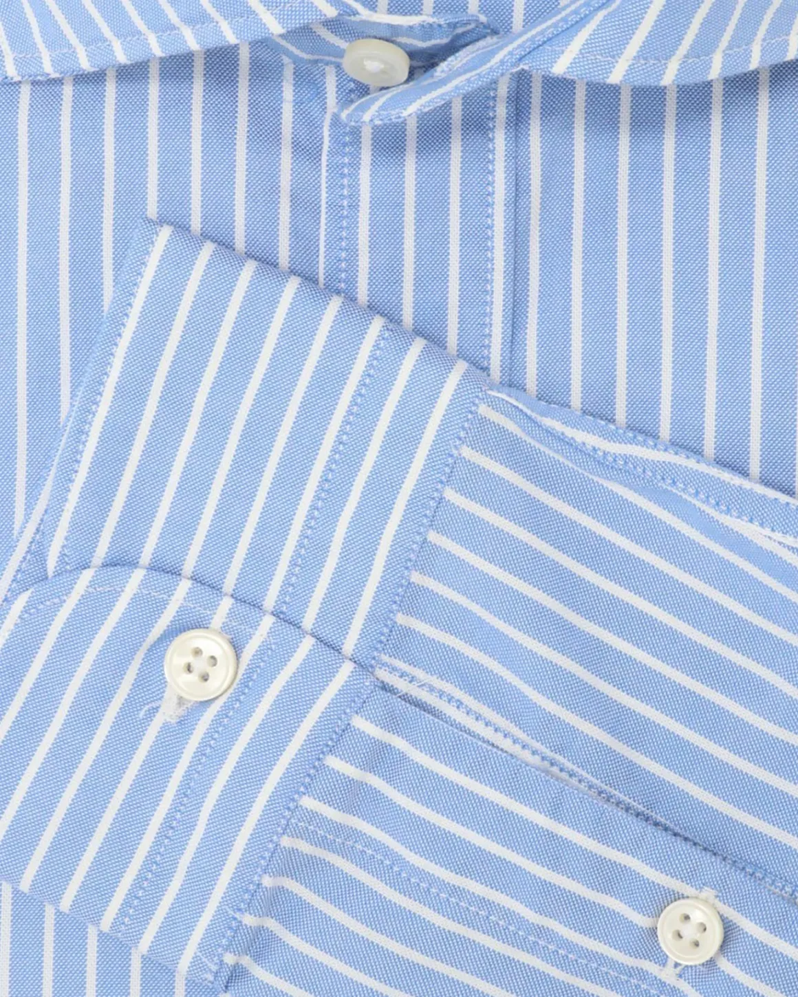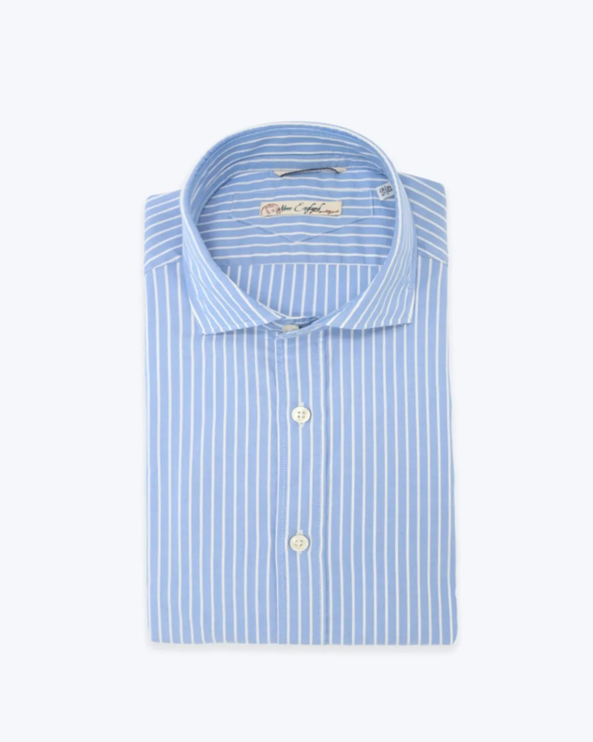 Camisa de la marca New England, en color azul con rayas blancas, con el cuello cutaway y tapeta con botones.