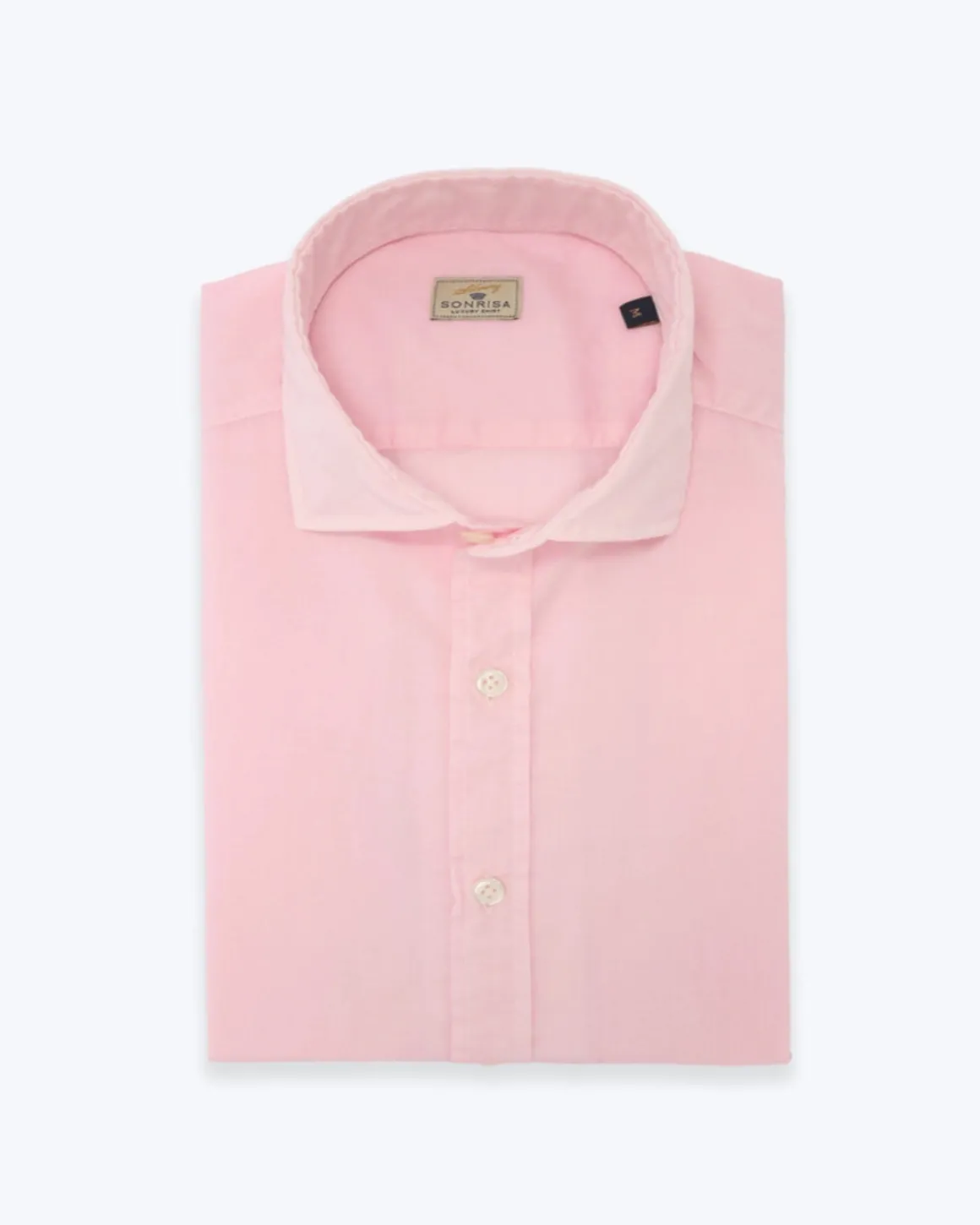 Camisa de color rosa, de la marca Sonrisa. Tiene cuello cutaway y tapeta con botones.