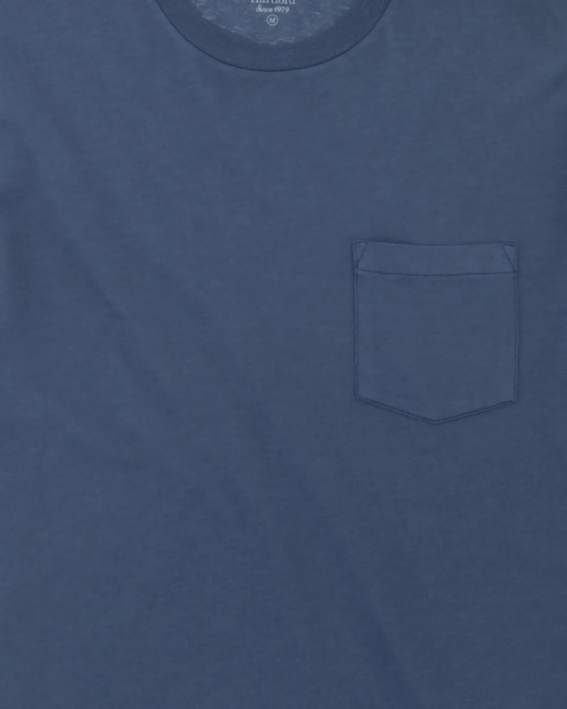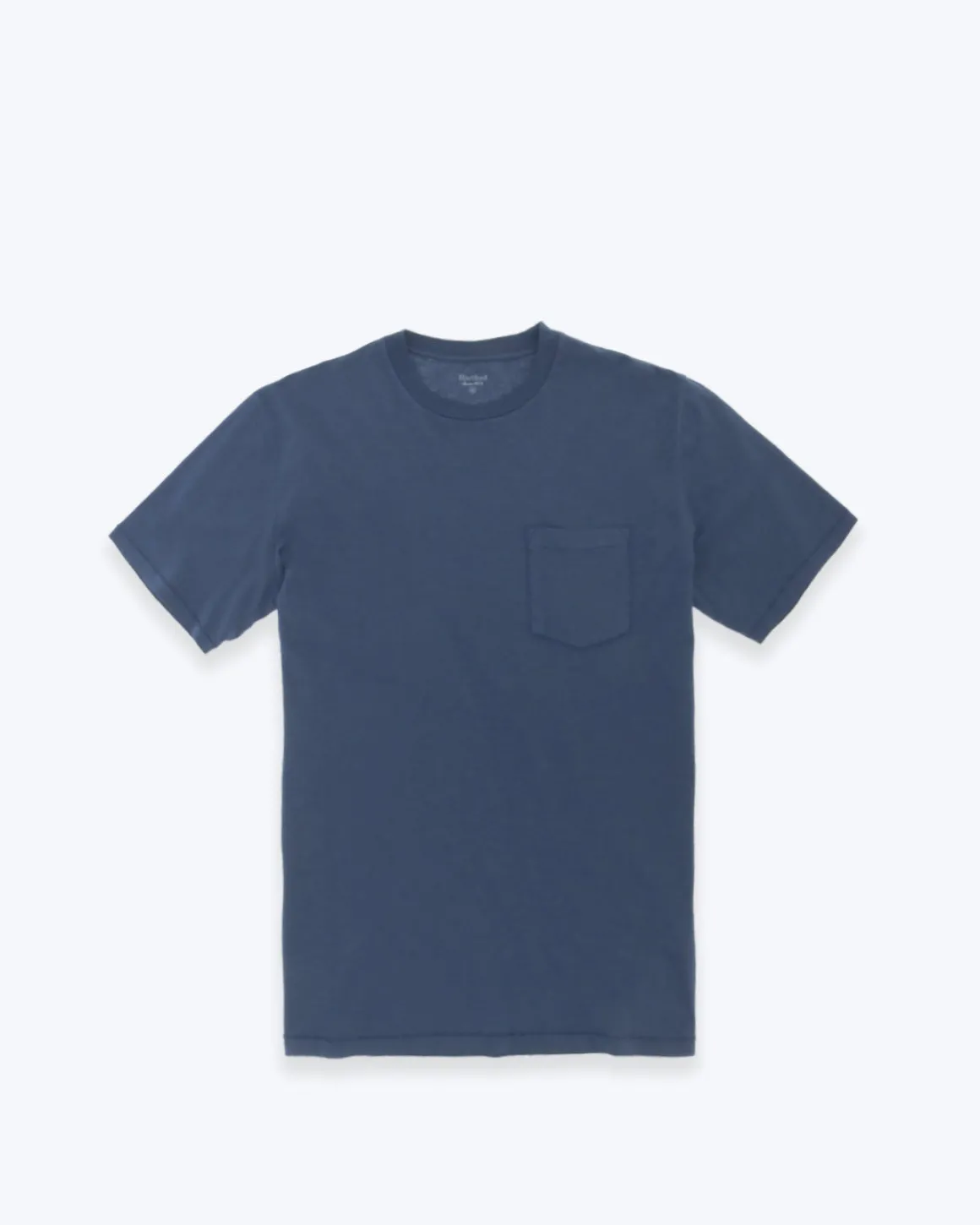 Camiseta de manga corta de la marca Deus, de color azul. Cuenta con un bolsillo a la altura del pecho en el lado derecho de la camiseta.