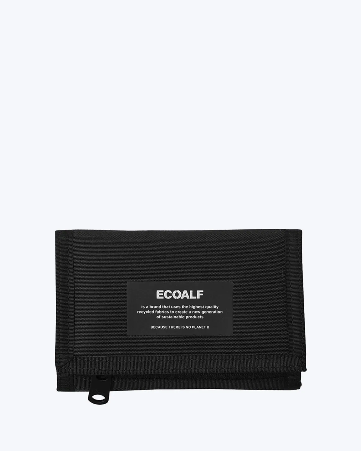 Cartera de la marca Ecoalf, en color negro, con compartimentos en el interior.