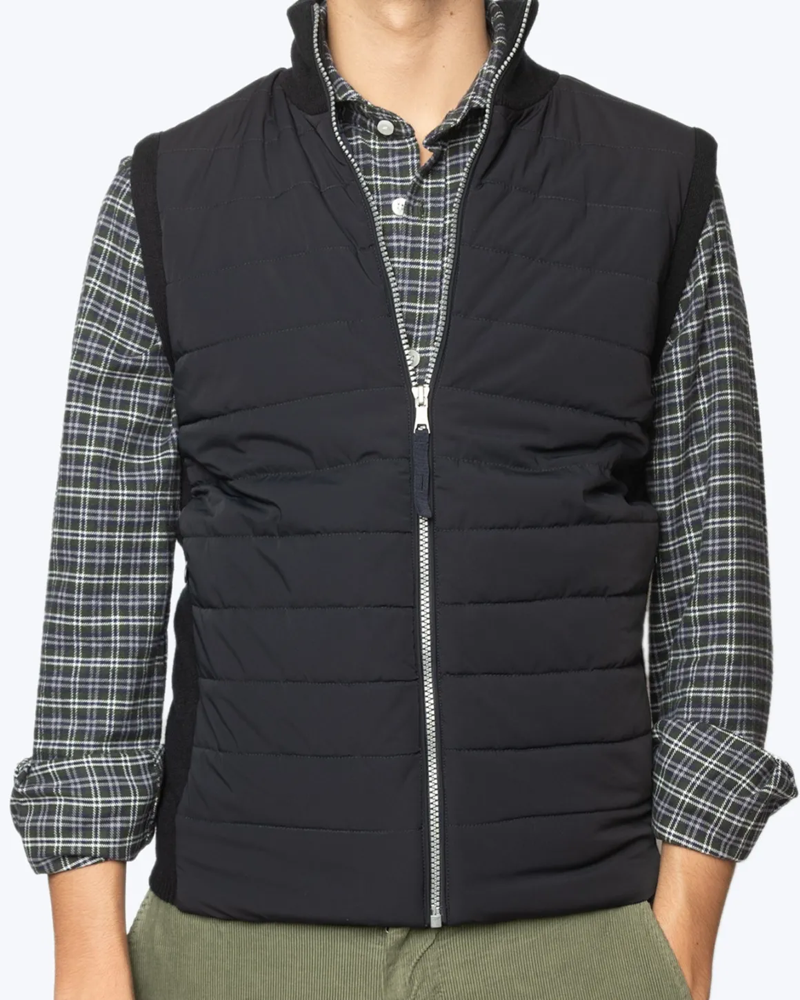 La parte delantera está acolchada, mientras que la parte trasera y el cuello son de tejido de punto. Tiene cierre frontal con cremallera y bolsillos laterales con cremallera oculta.