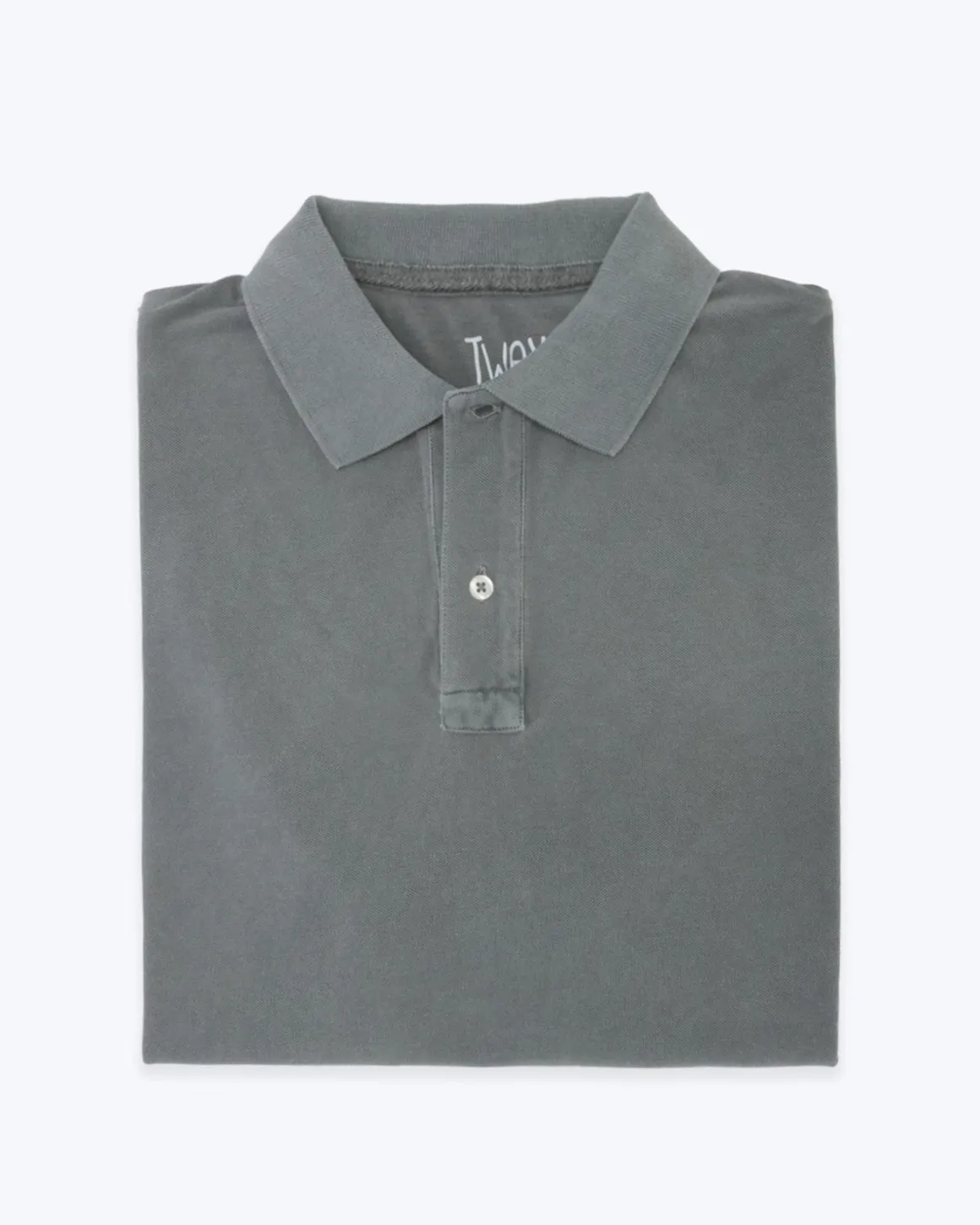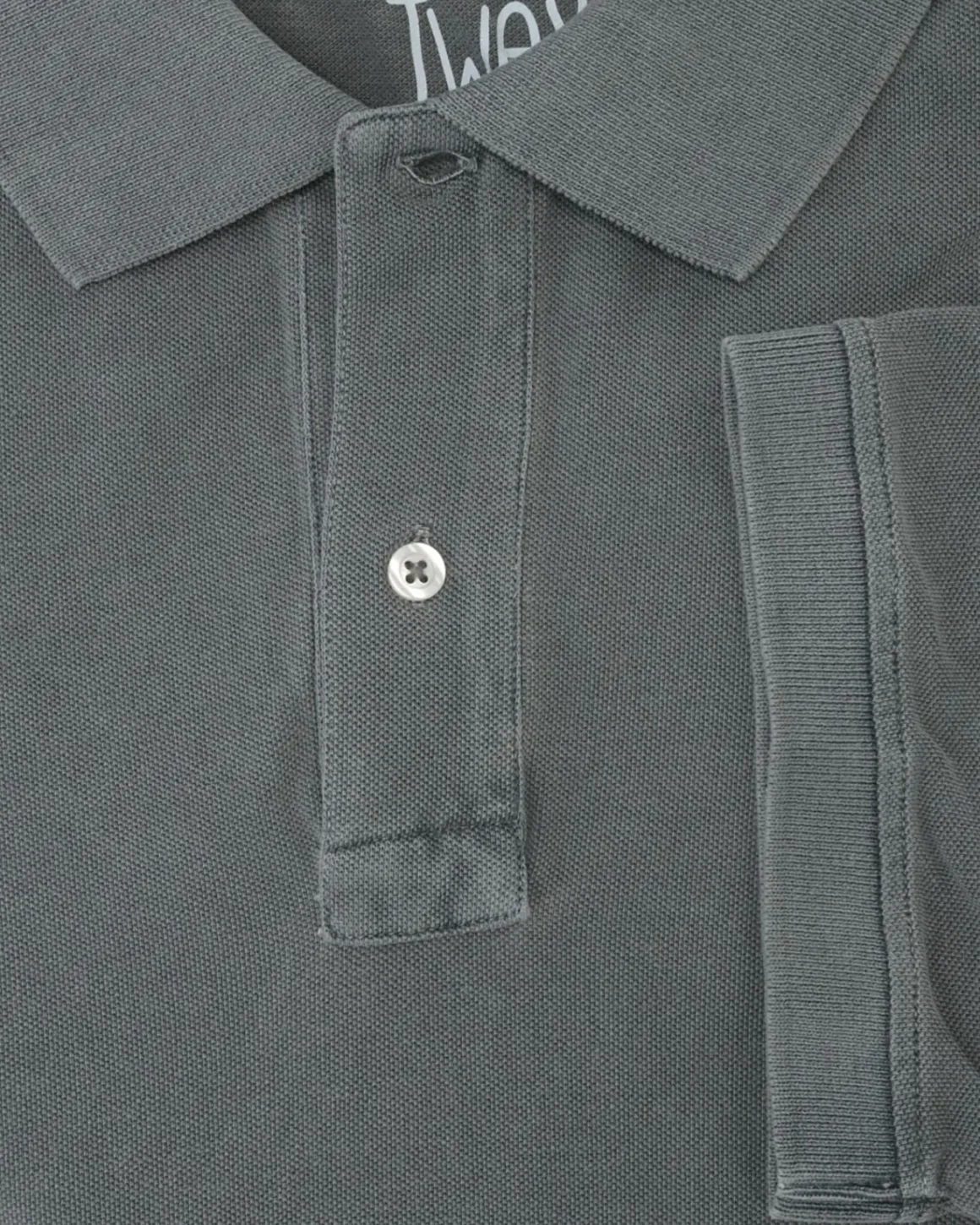Polo de manga corta de piqué, de la marca Tway, en color gris. Presenta cierre frontal con dos botones.