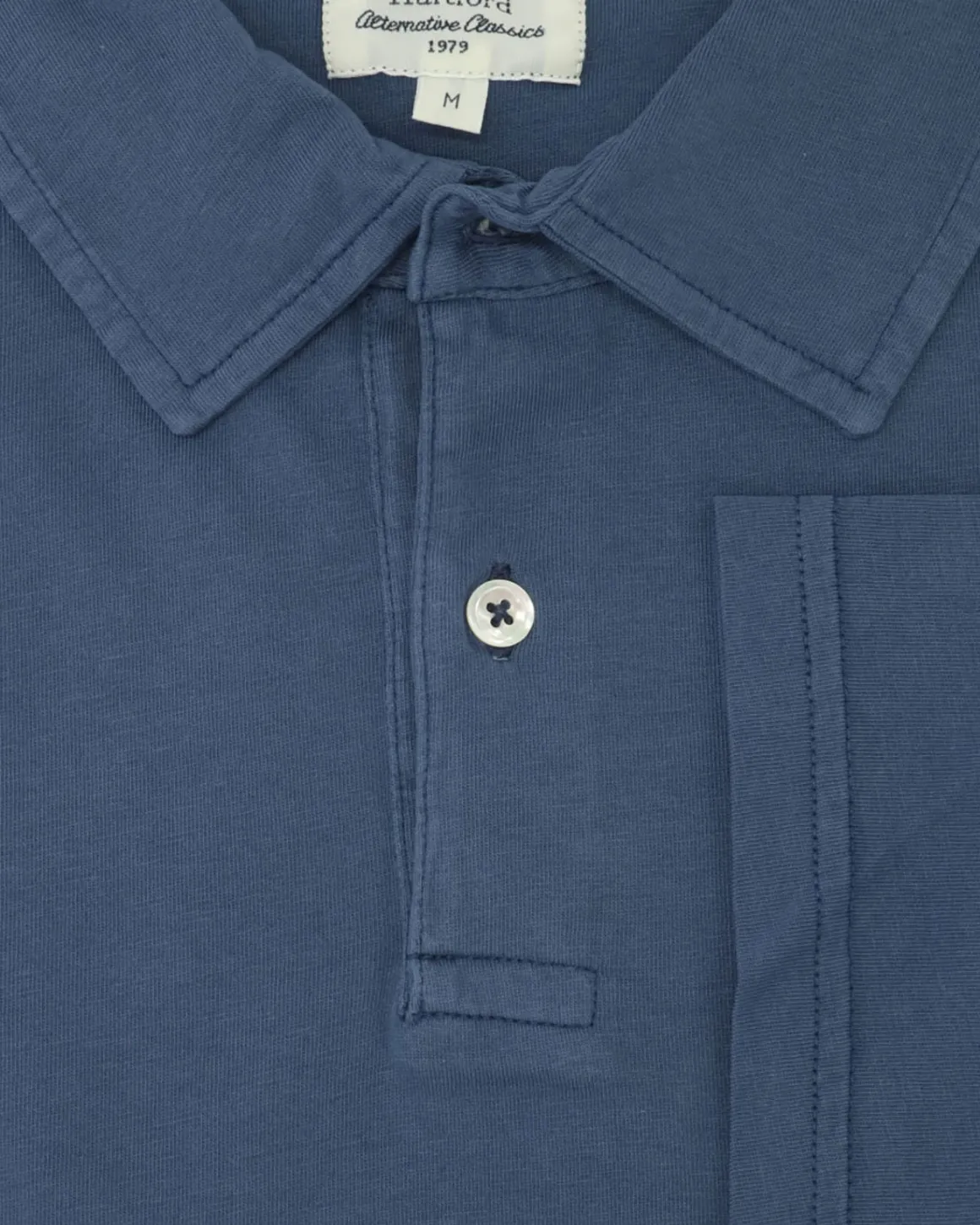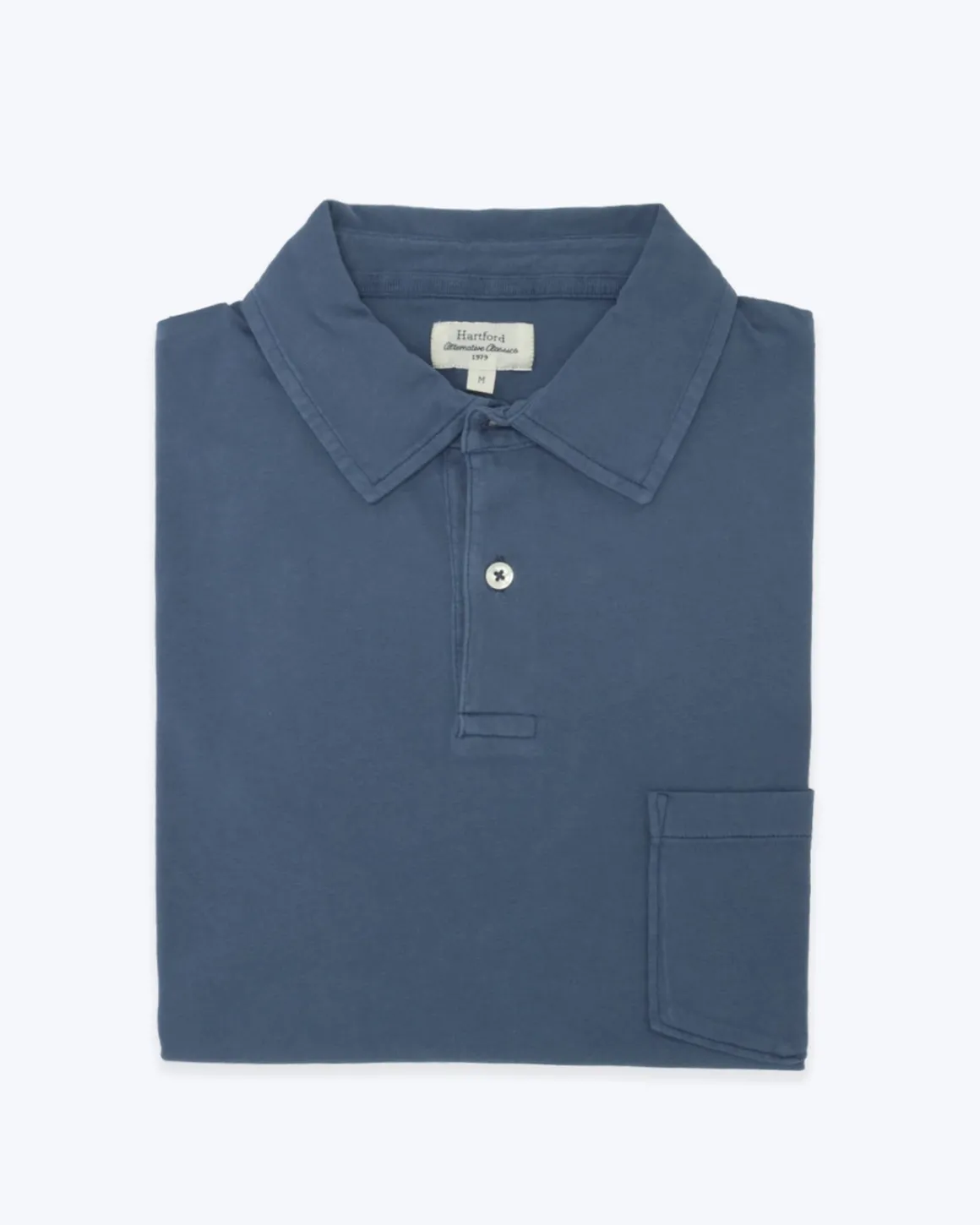 Polo manga corta de jersey de la marca Hartford, color azul. Cuello clásico, cierre frontal con dos botones y bolsillo a la altura del pecho.