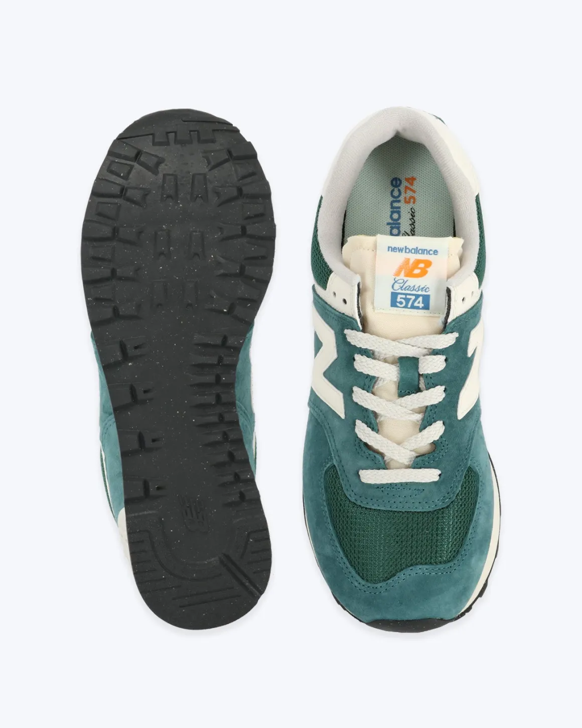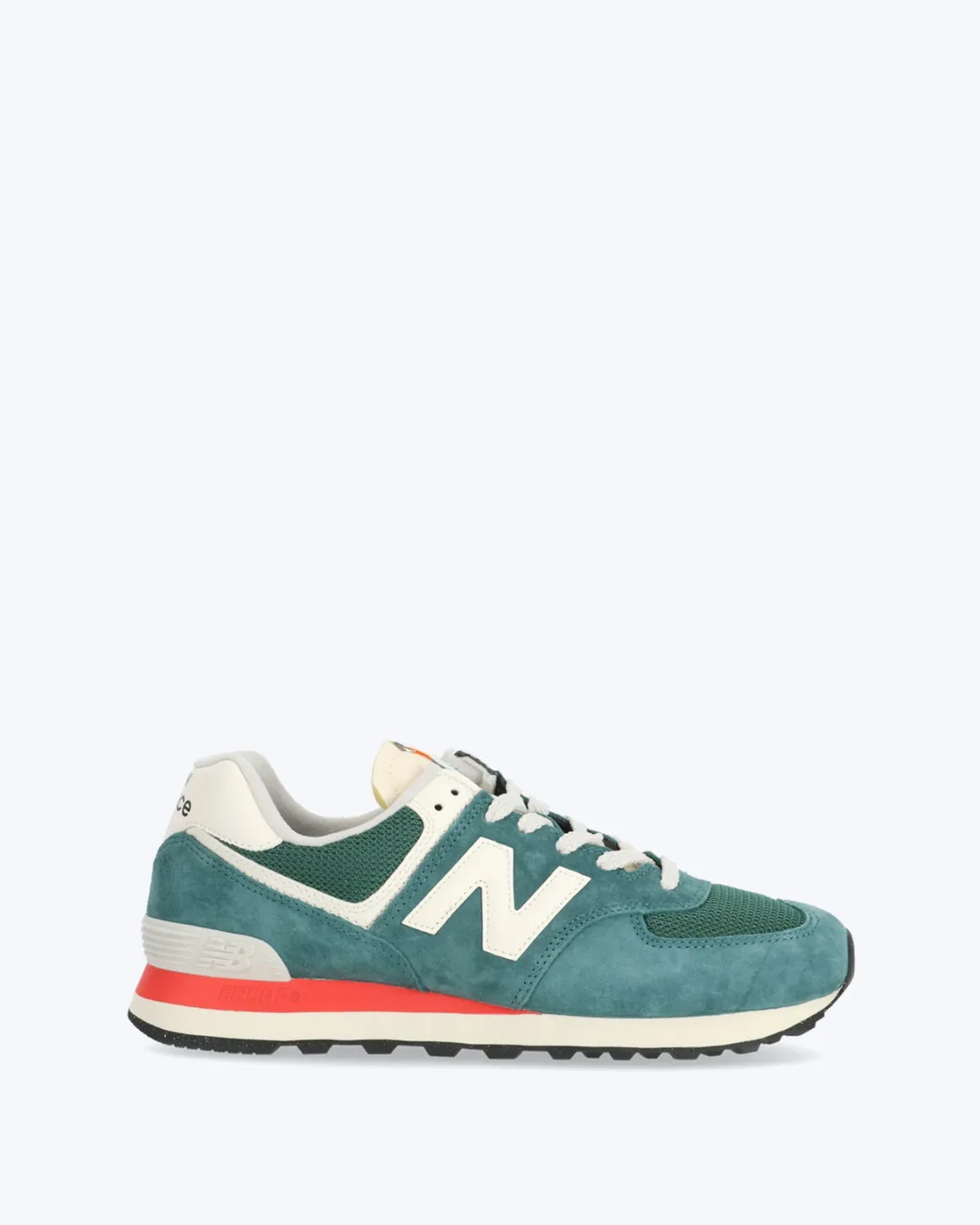 Zapatillas New Balance modelo 574, de ante en color verde, con detalles en color rosa y blancos.