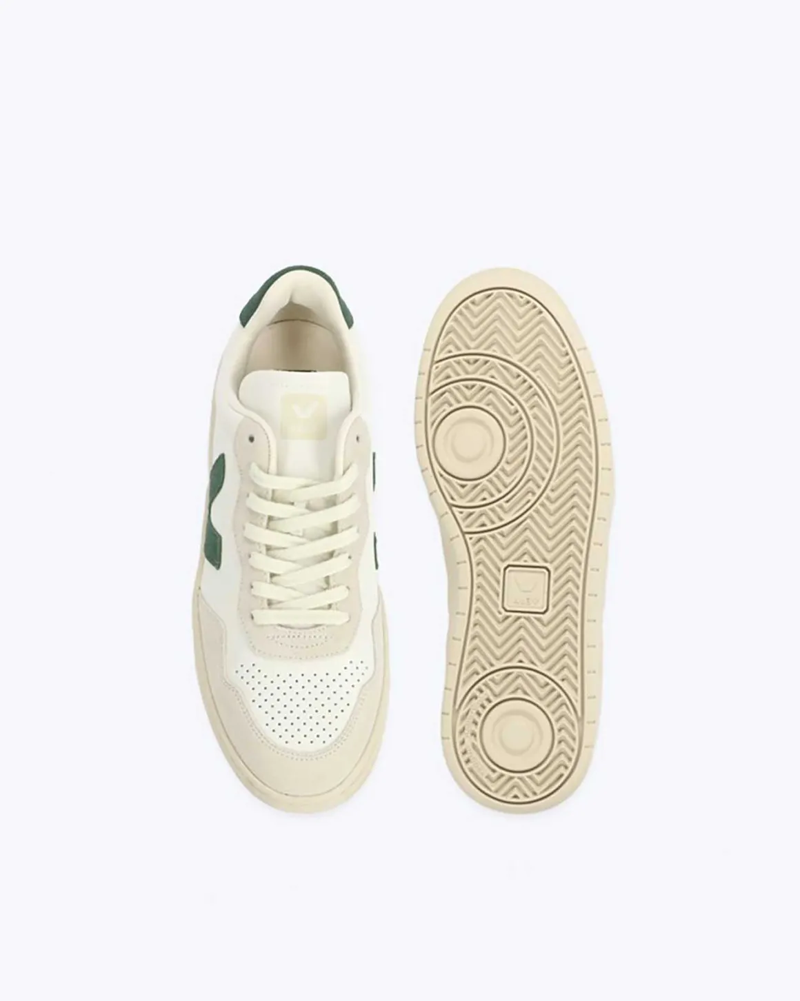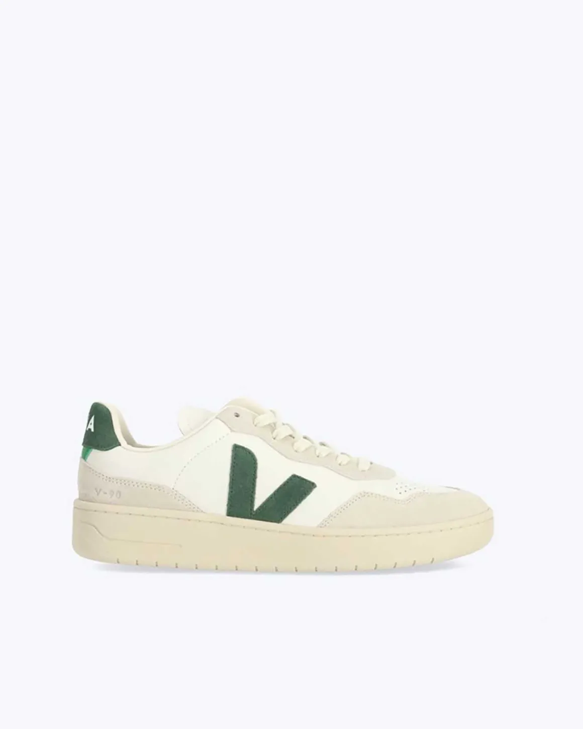 Zapatillas Veja blanco-verde, modelo V-90, hecho de materiales ecológicos y sostenibles.